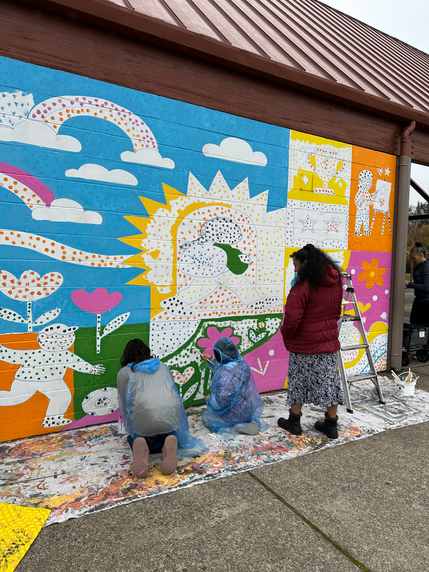 True to life in the Pacific Northwest, we navigated a bit of rain in the middle of the project, but the community showed up with so much enthusiasm that the weather couldn’t slow us down. Families, neighbors, and students all picked up brushes and helped bring the artwork to life.